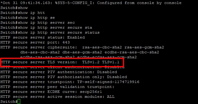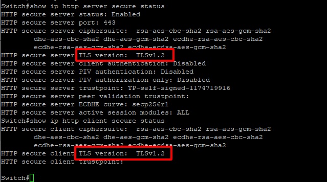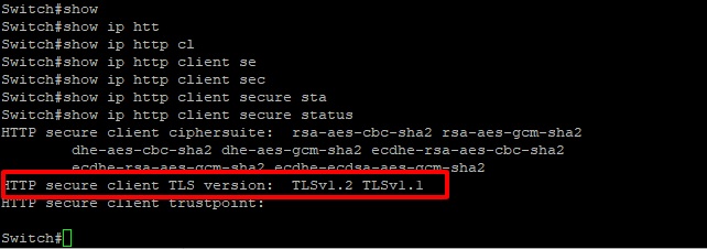 Switch(config)#ip http tls-version Tlsv1.2 Switch(config)#ip http client tls-version Tlsv1.2